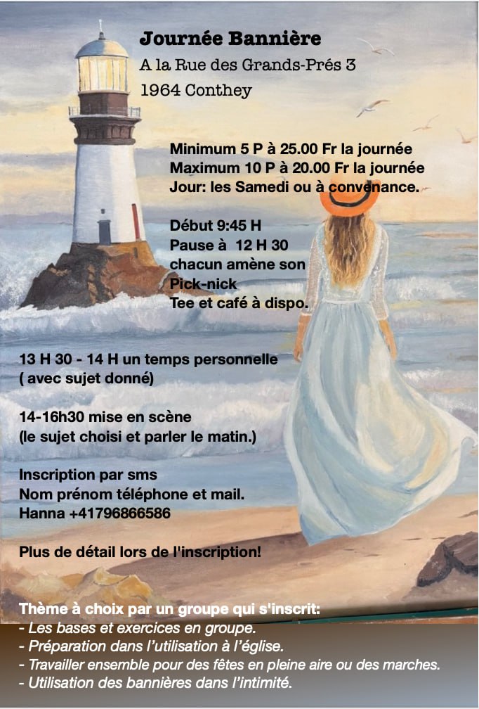 J'aime utiliser les bannières avec des dessins, présentant la parole de Dieu : Exode 17:15 — Moïse bâtit un autel et lui donna pour nom : « L’Éternel est ma bannière ». En effet, il est la bannière de l’amour au-dessus de moi, et lorsque je marche sous sa bannière, ma louange et mon intercession transmettent l’amour du cœur du Père ; la bannière devient alors le prolongement de ma personne par le mouvement que je lui accorde. Chaque bannière « spécifique », à un moment donné, avec l’aide de l’Esprit Saint, peut représenter une action particulière — Psaume 60:4 (6) : « Tu as donné à ceux qui te craignent une bannière, pour qu’elle s’élève à cause de la vérité. »